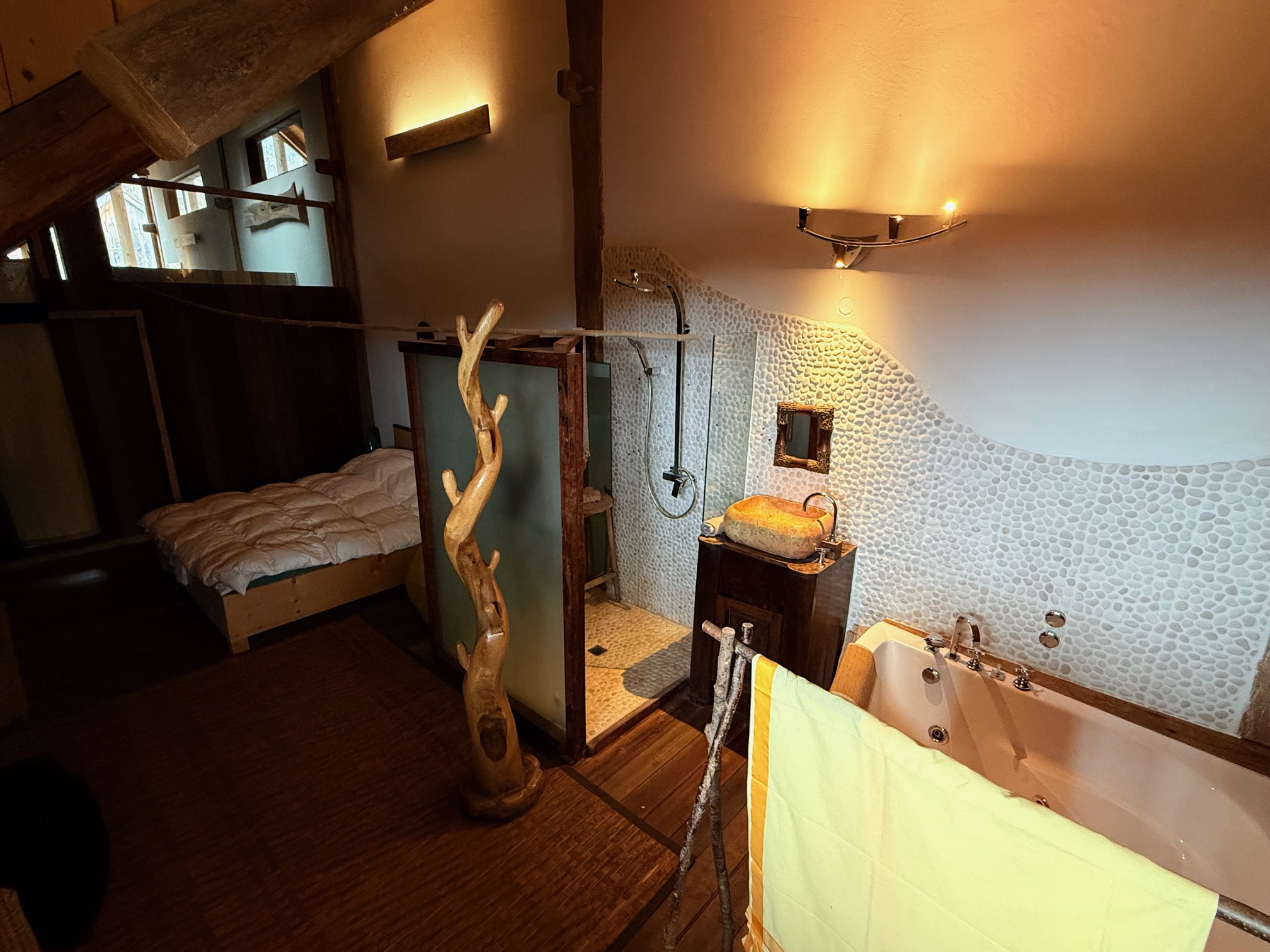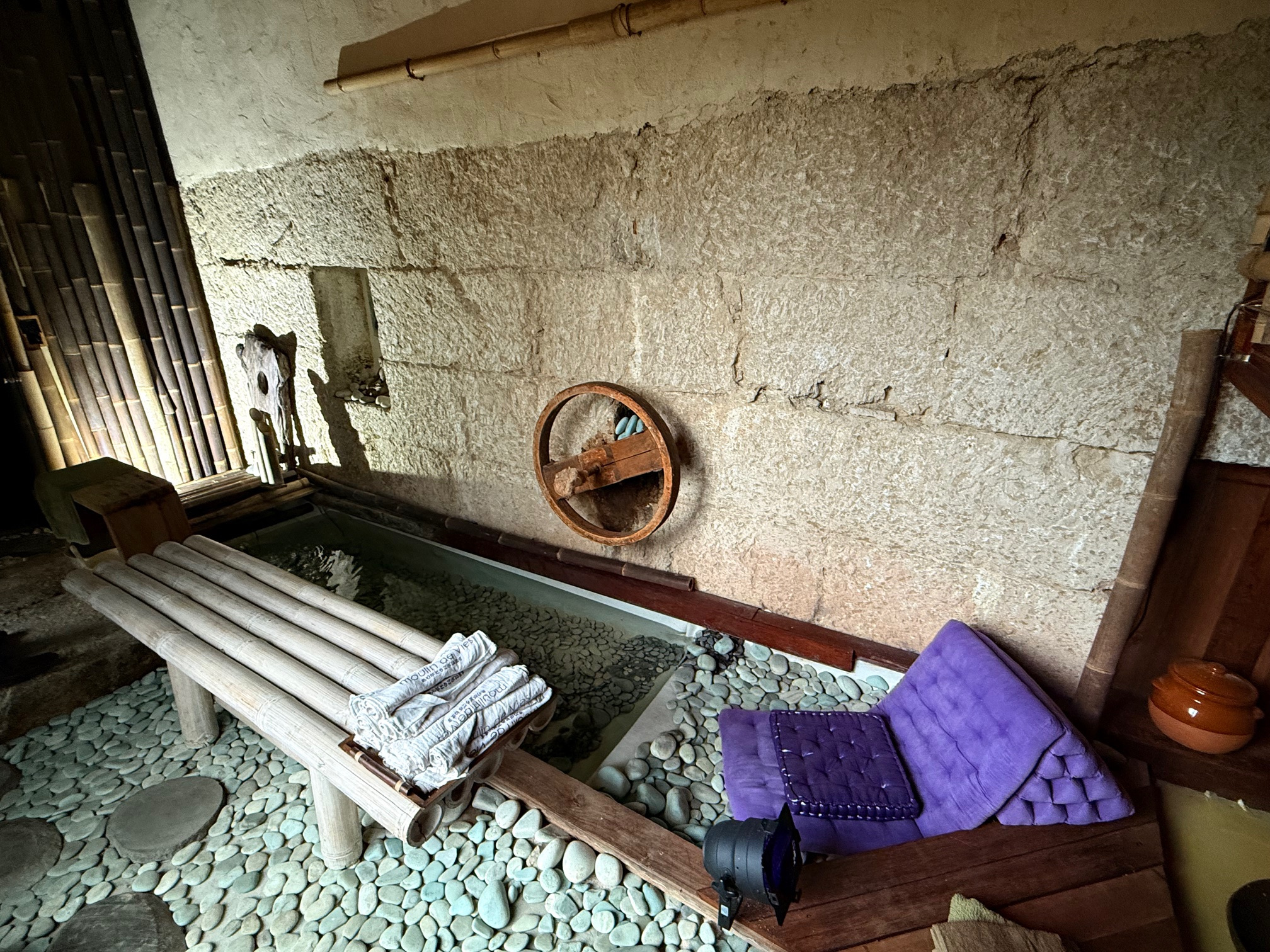 Pensé comme un lieu de retraite intimiste, dédié au bien-être et à l’harmonie avec la nature, le domaine a été restauré avec un soin remarquable en privilégiant des matériaux nobles et naturels importés directement d’Asie. Bois massifs, pierres naturelles, textiles organiques et finitions artisanales composent un univers où aucun matériau synthétique ni plastique n’a été utilisé, dans une démarche écologique et holistique.